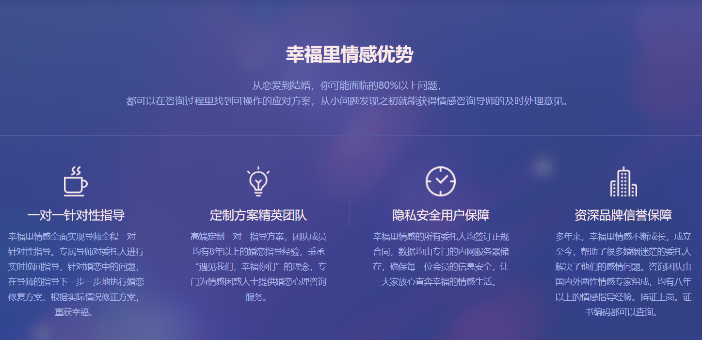 幸福里情感本着真诚、尊重、关爱的原则,专注于高效修复感情,分离小三,挽救婚姻,分居情变矫正、婚前辅导、自我提升等情感咨询服务。